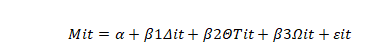 This equation represents a straight-line regression model, allowing the measurement of how reforms (ΘT) and shocks (Ω) influence mismanagement (M), given underlying inefficiency (Δ).